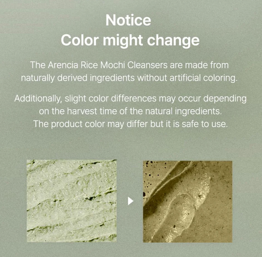 The Arencia Fresh Green Rice Mochi Cleanser provides gentle brightening and moisturising care, leaving skin clear and hydrated. Enriched with Witch Hazel which is rich in Vitamin A and C to brighten skin, Rice Water to nourish skin and Hyssop Extract to calm skin. The cleanser's unique 170-hour freshening process ensures a potent infusion of hydration and nutrition, gently lifting away dead skin cells and unveiling a natural, healthy glow. Arencia's signature rice cake or mochi-like texture provides a gentle yet thorough, deep cleansing of pores, leaving skin smoother and nourished.