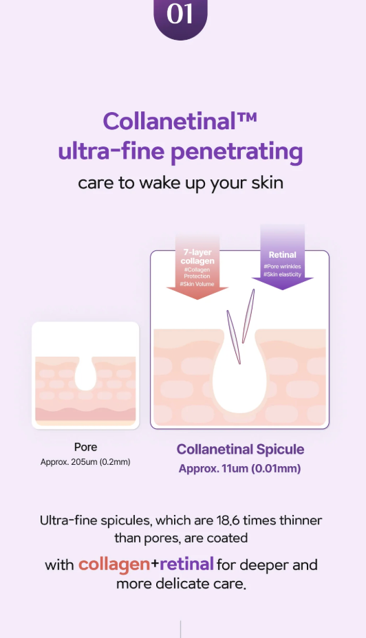 - Ultra-tine soicules which are 186 times thinner with collagen+retinal for deeper and more delicate care.