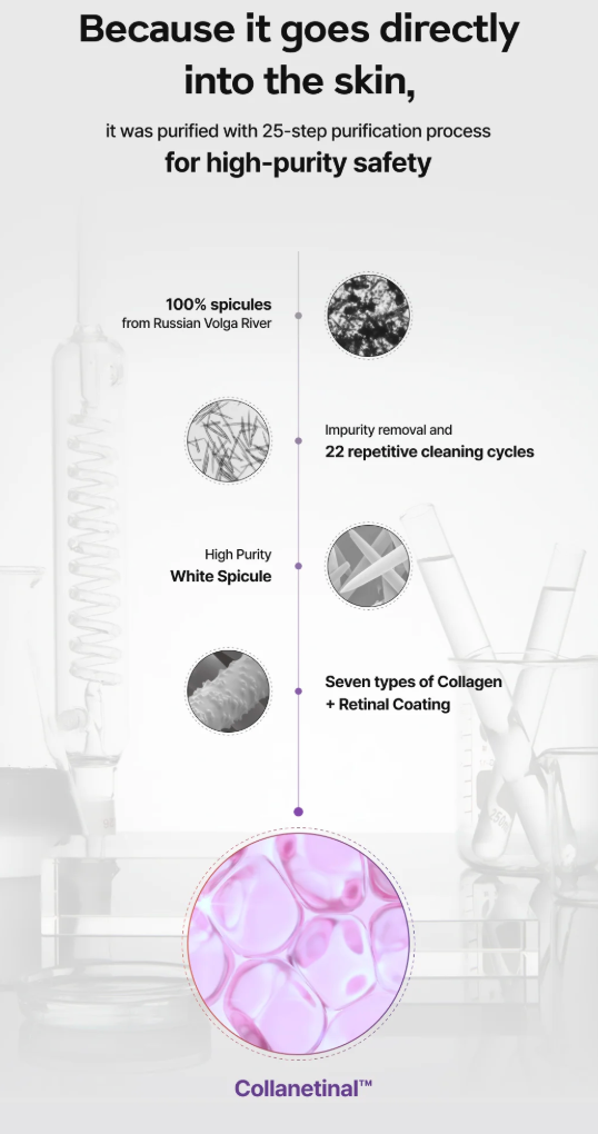 It is an invisible micro-sized microneedle extracted from the clear and clean freshwater surface of the Volga River in Russia, which penetrates directly into the skin and induces skin cell regeneration for about 72 hours, and then sheds naturally to help the skin circulate and recover. Because it goes directly into the skin, it was purified with 25-step purification process for high-purity safety.