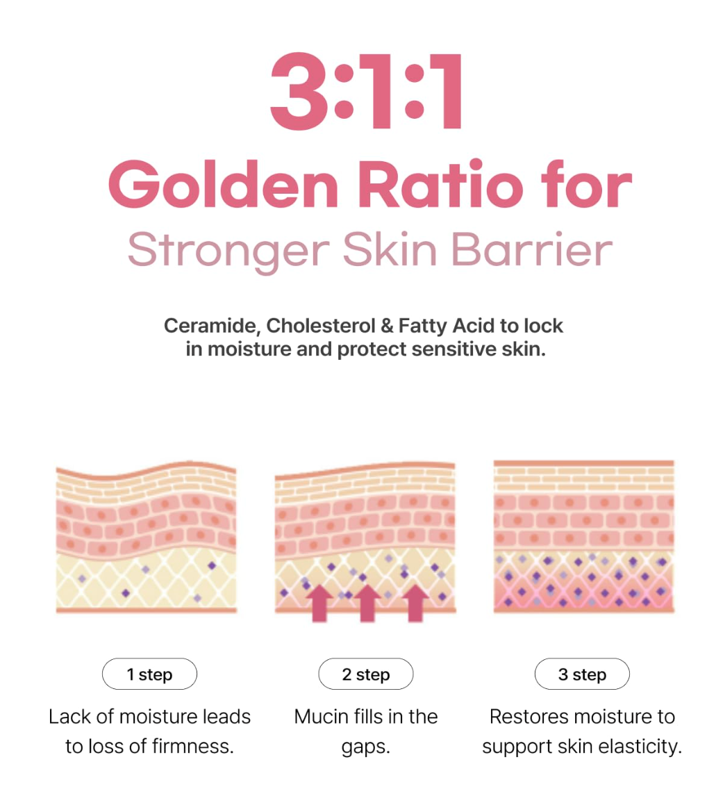 - The light pink essence layer is formulated with Ceramide, Fatty Acid, and Cholesterol and a 3:1:1 ratio to moisturize and repair skin barrier.