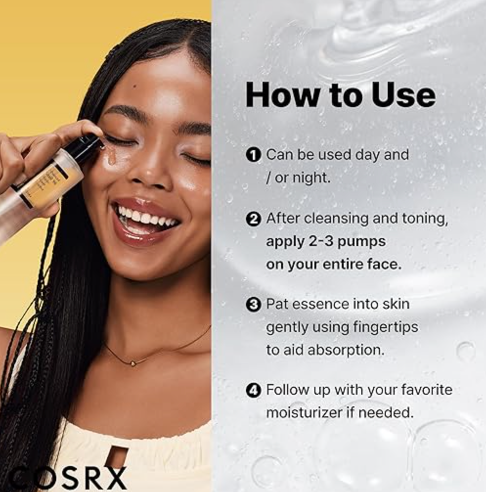 After cleansing and toning, dispense a small amount of the COSRX Advanced Snail 96 Mucin Power Essence onto your palms.Gently massage into the skin and pat for better absorption.Follow with serums and moisturisers for a complete skincare routine.