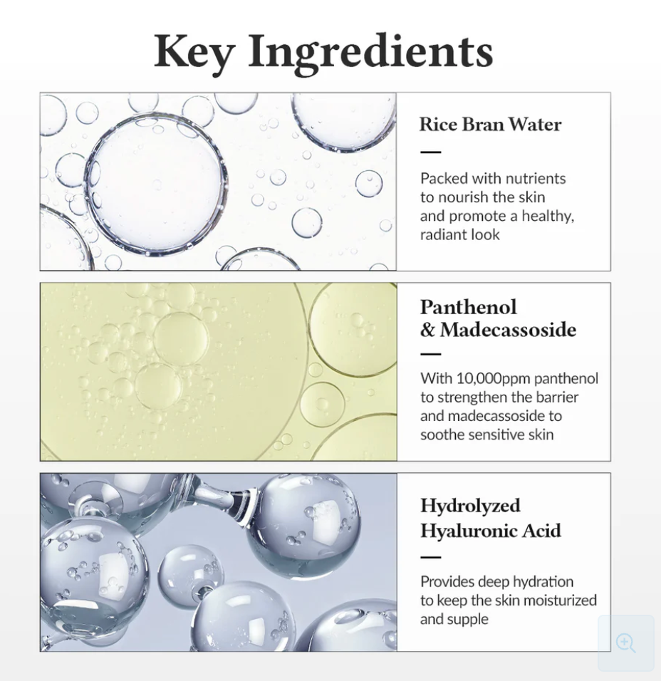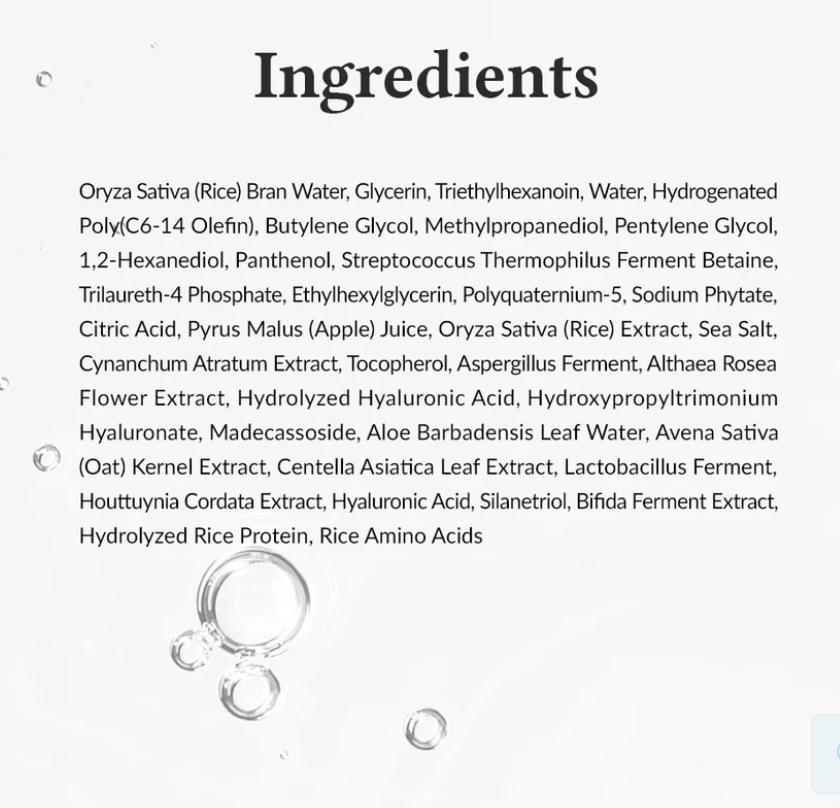 Oryza Sativa (Rice) Bran Water, Glycerin, Triethylhexanoin, Water, Hydrogenated Poly(C6-14 Olefin), Butylene Glycol, Methylpropanediol, Pentylene Glycol, 1,2-Hexanediol, Panthenol, Streptococcus Thermophilus Ferment, Betaine, Trilaureth-4 Phosphate, Ethylhexylglycerin, Polyquaternium-51, Sodium Phytate, Citric Acid, Pyrus Malus (Apple) Juice, Oryza Sativa (Rice) Extract, Sea Salt, Cynanchum Atratum Extract, Tocopherol, Aspergillus Ferment, Althaea Rosea Flower Extract, Hydrolyzed Hyaluronic Acid, Madecassoside, Hydroxypropyltrimonium Hyaluronate, Aloe Barbadensis Leaf Water, Centella Asiatica Leaf Extract, Avena Sativa (Oat) Kernel Extract, Lactobacillus Ferment, Houttuynia Cordata Extract, Hyaluronic Acid, Silanetriol, Bifida Ferment Extract, Hydrolyzed Rice Protein, Rice Amino Acids