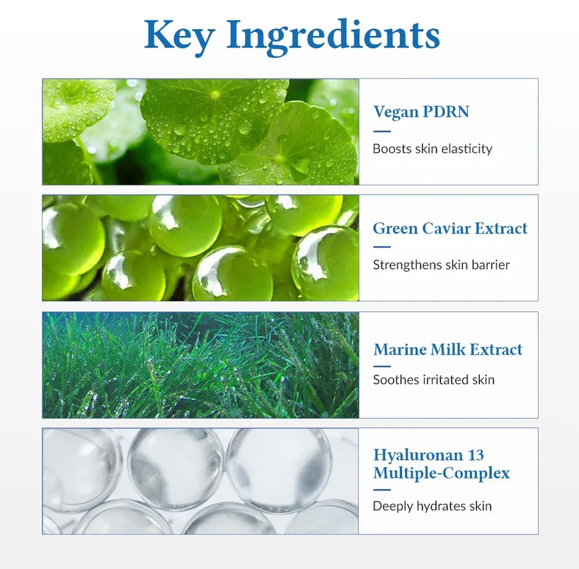 Bambusa Vulgaris Water, 1,2-Hexanediol, Propanediol, Water, Glycerin, Hydrogenated Polydecene, C14-22 Alcohols, C12-20 Alkyl Glucoside, Caprylic/Capric Triglyceride, Codium Fragile Extract, Palmaria Palmata Extract, Chondrus Crispus Extract, Sargassum Pallidum Extract, Butylene Glycol, Hyaluronic Acid, Hydrolyzed Hyaluronic Acid, Sodium Hyaluronate, Panthenol, Vinyl Dimethicone, Cetyl Alcohol, Carbomer, Tromethamine, Sodium DNA, Hydrogenated Lecithin, Dextrin, Gardenia Florida Fruit Extract, Polyglutamic Acid, Hydrolyzed Sodium Hyaluronate, Hydroxypropyltrimonium Hyaluronate, Potassium Hyaluronate, Sodium Hyaluronate Crosspolymer, Pentylene Glycol, Sodium Acetylated Hyaluronate, Guaiazulene, Agave Tequilana Leaf Extract, Sodium Retinoyl Hyaluronate, Zinc Hydrolyzed Hyaluronate, Dimethylsilanol Hyaluronate, Sodium Benzoate, Ascorbyl Propyl Hyaluronate, Ascorbylpropyl Hydrolyzed Hyaluronate, Caulerpa Lentillifera Extract, Ethylhexylglycerin, Disodium EDTA