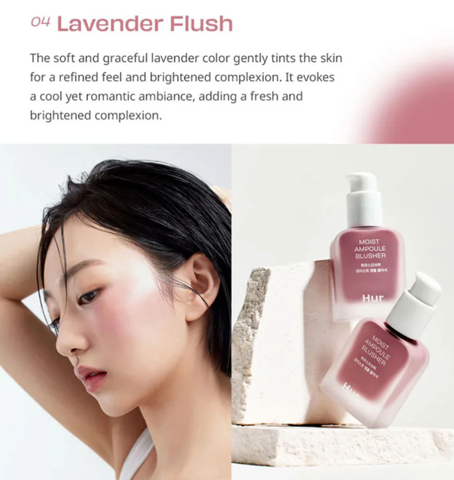 The House of Hur Moist Ampoule Blusher is a light and hydrating ampoule-type blusher, similar to an essence, that gently seeps into the skin, creating a clear complexion with watercolour-like pigmentation in one touch. This revolutionary formula combines an airy, lightweight texture with a hydrating essence blend, providing your skin with a luminous and long-lasting glow. Can be used comfortably all day long without stickiness, keeping the skin feeling and looking refreshed!