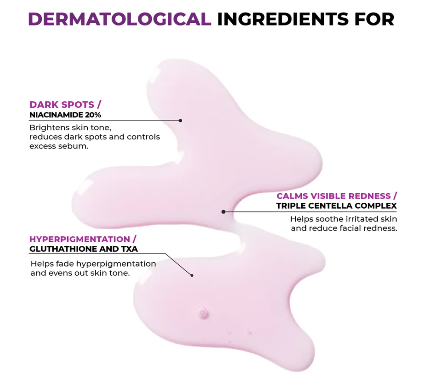 - A pore refining serum infused with 20% Niacinamide and TXA to brighten dull skin tone and reduce dark spots, while controlling excess sebum.