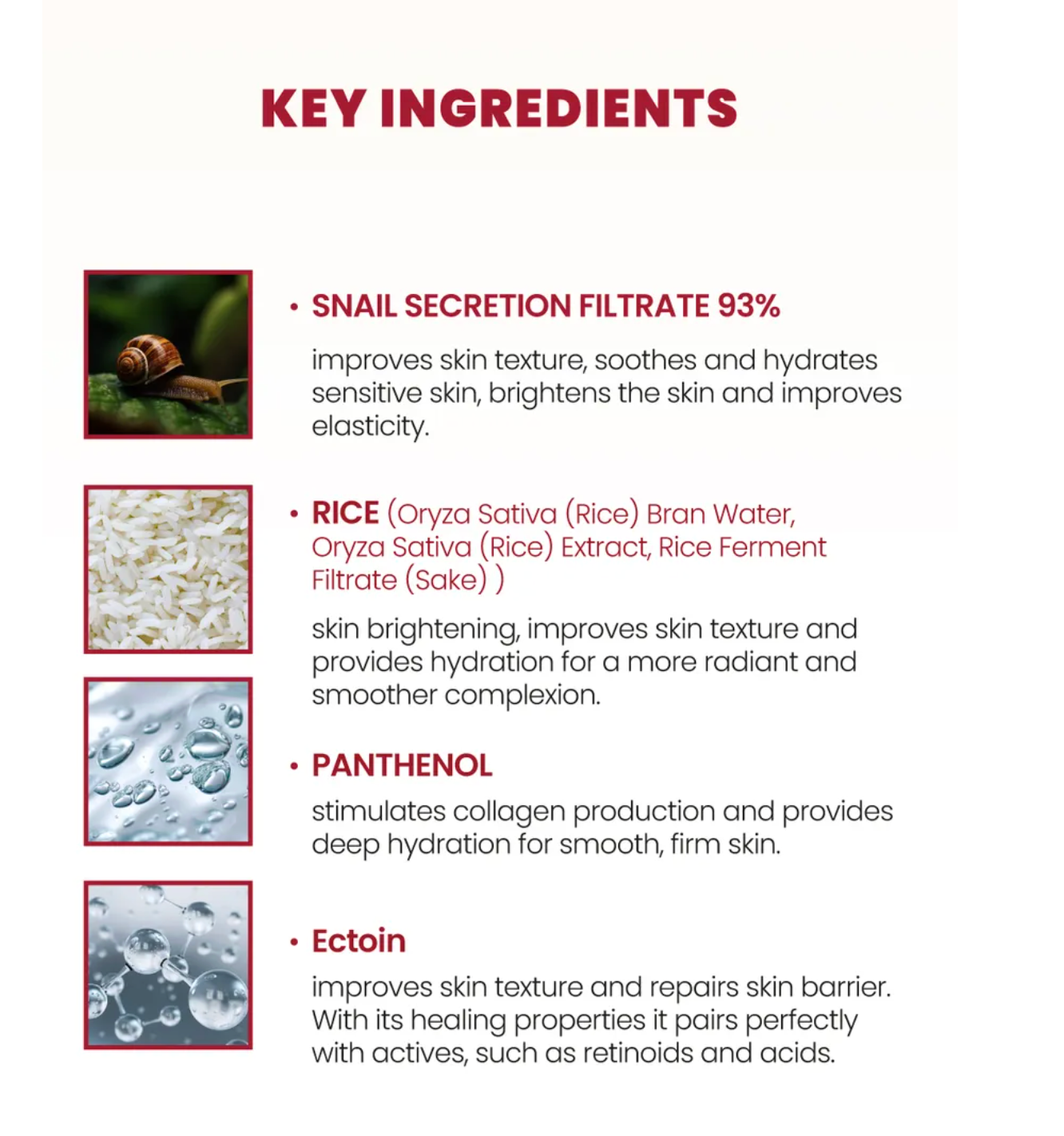 - This cream enriched with 93% of Snail Secretion Filtrate and Rice Ferment Filtrate (Sake) provides deep hydration, skin brightening and soothing effects and helps strengthen skin barrier.