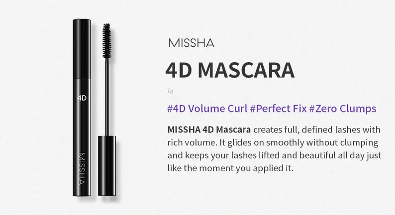 - MISSHA 4D Mascara is a volumizing mascara for thicker eyelashes.