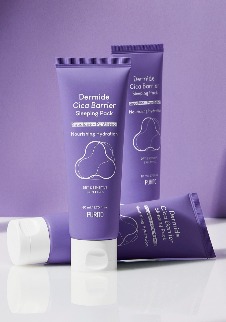 Purito Dermide Cica Barrier Sleeping Pack helps to deeply hydrate and soothe skin overnight.