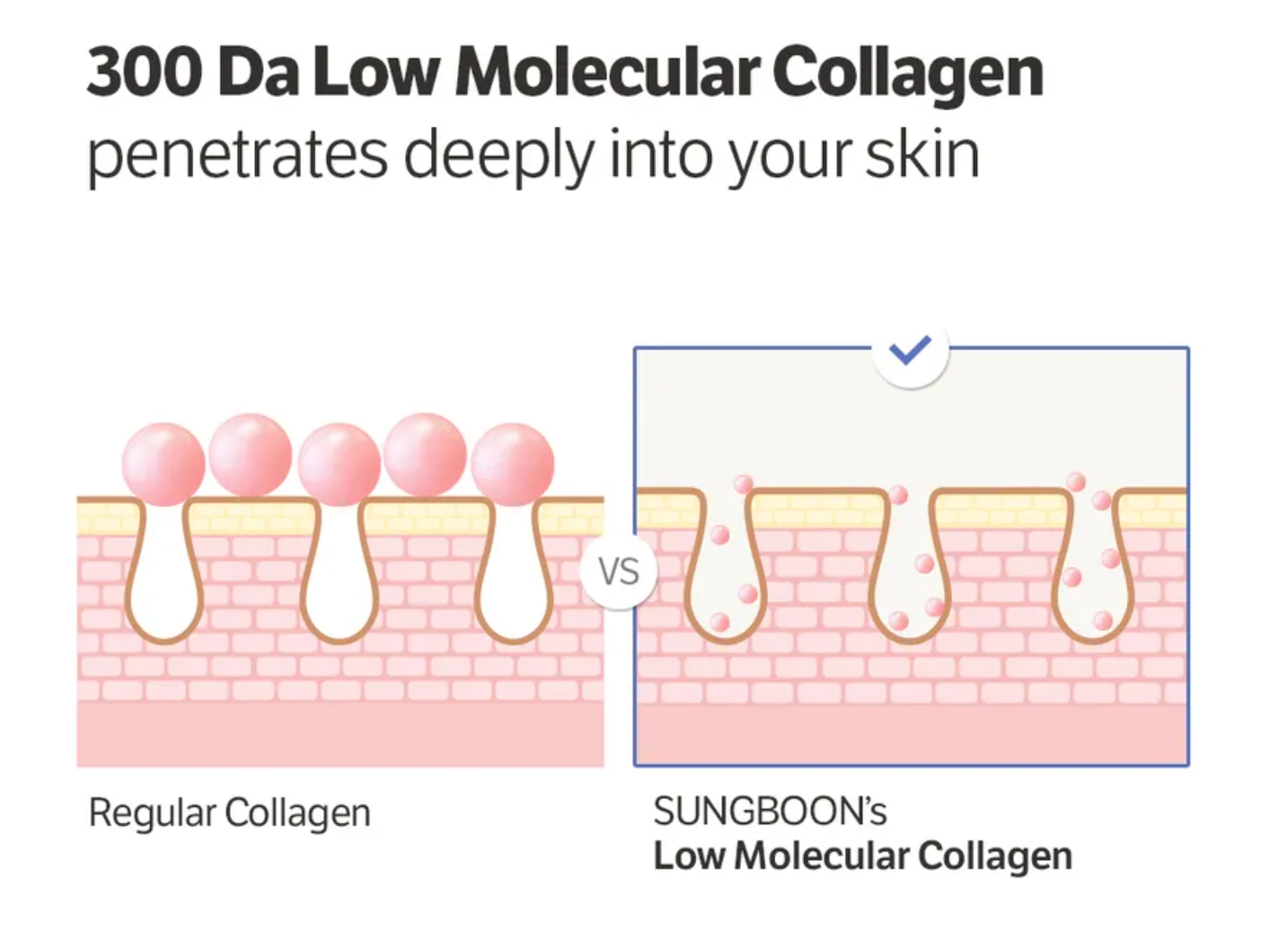 - Ultra micro absorb Collagen is 300Da, which is 1/50,000 the size of the pore which absorbs very well to the skin.