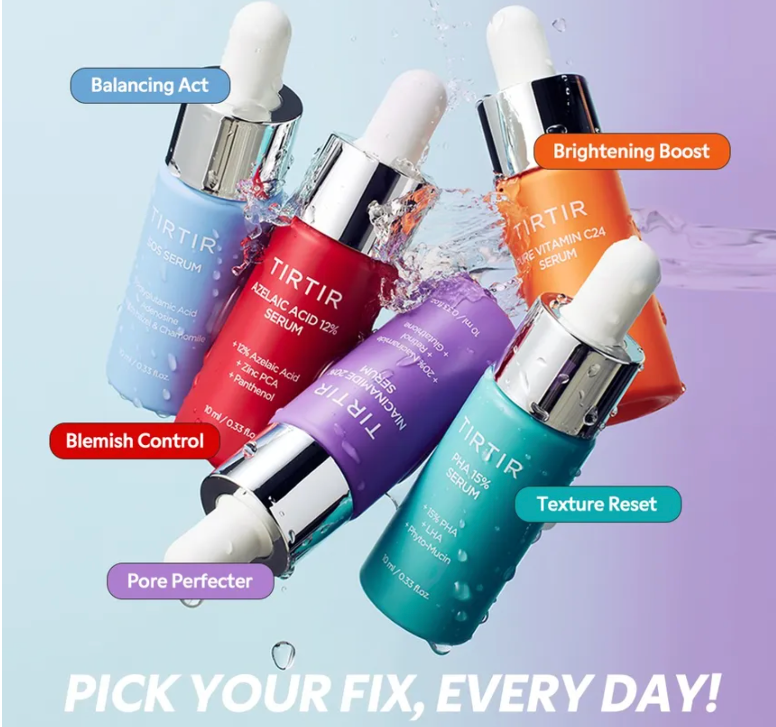 Benefits: Five mini bottles of TIRTIR serum help from brightening to pore care.