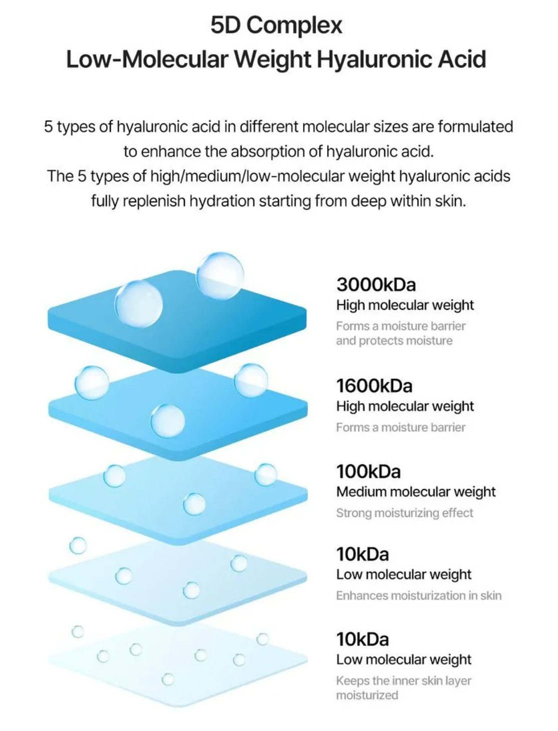 - 5D-Complex Hyaluronic Acid instantly replenishes ample moisture for dewy, smooth skin express.