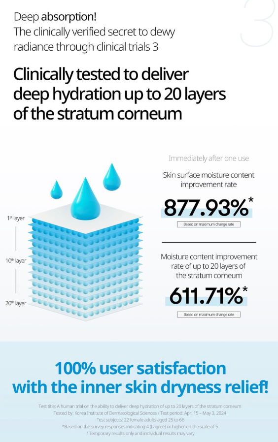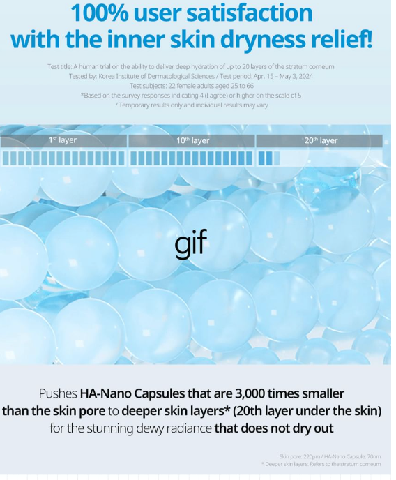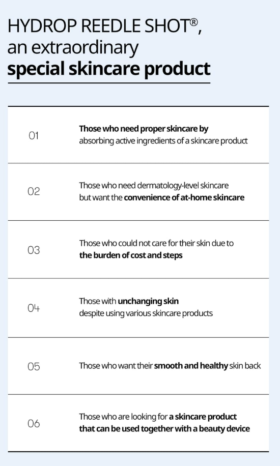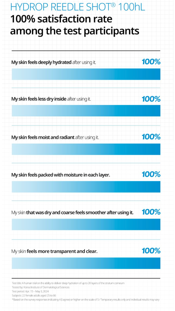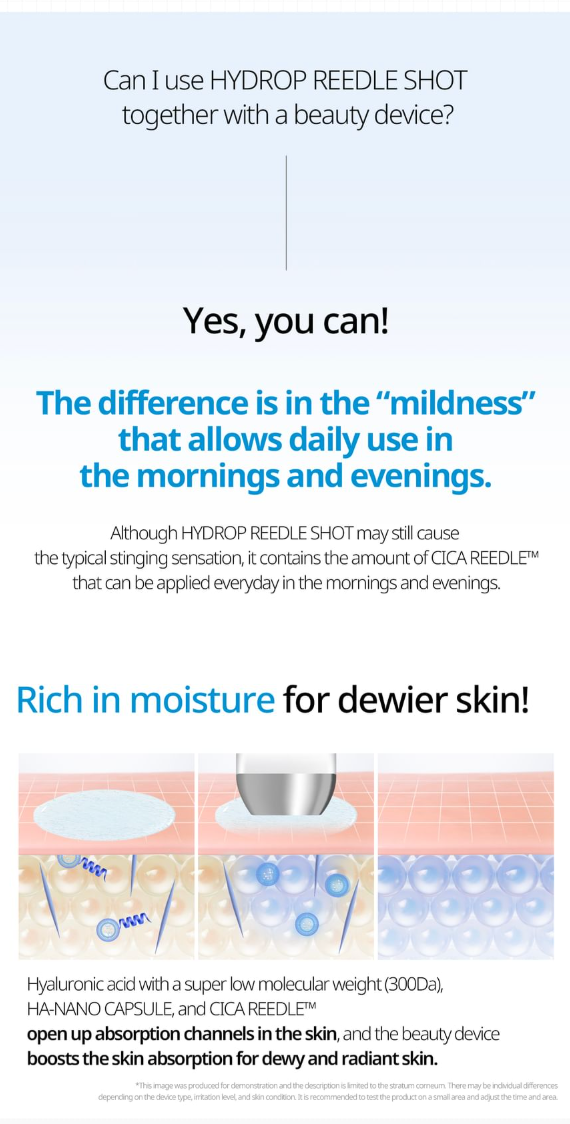 - This Hydrop Reedle Shot 100hL with low molecular hyaluronic acid boosts skin with moisture, creating a dewy and healthy-looking skin.