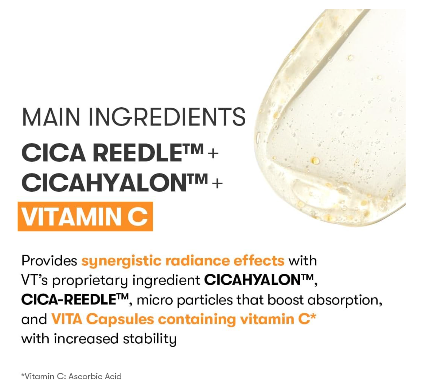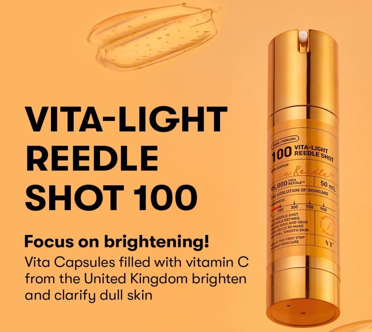 VT Cosmetics Vita-Light Reedle Shot 100 with Vitamin C helps refine and brighten rough skin to achieve smooth and dewy skin.